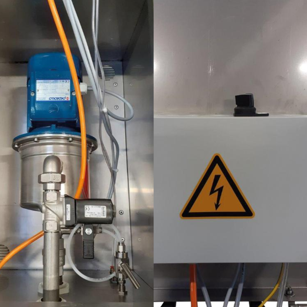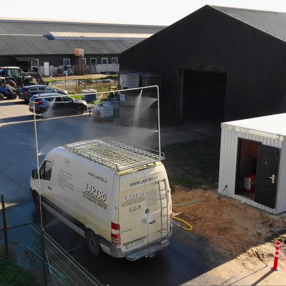 Kad transportlīdzeklis iebrauc fermā, brīdinājuma šļūtene aktivizē vadības bloku un sūkni, kas iesūc dezinfekcijas līdzekli. Dezinfekcijas līdzeklis tiek sajaukts ar ūdeni no uzglabāšanas tvertnes un caur sprauslām izsmidzināts uz transportlīdzekļa un zem tā.