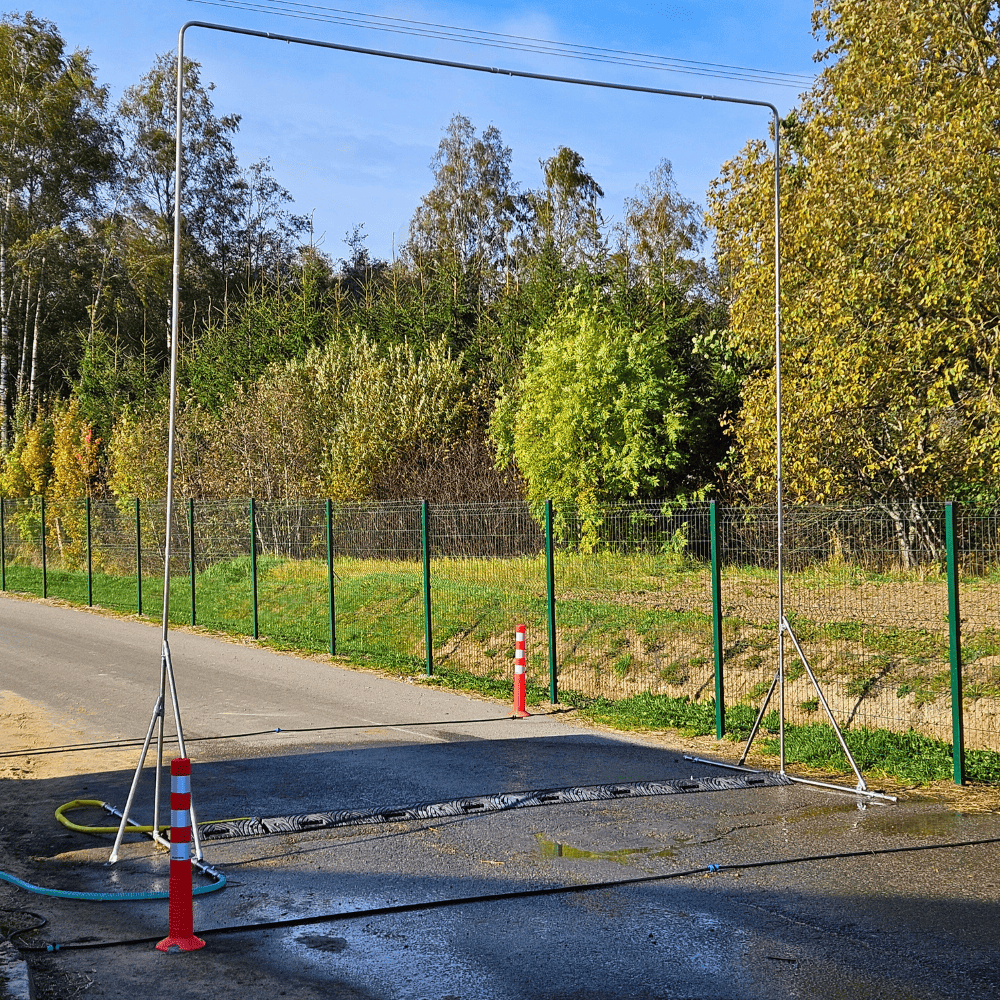 Transportlīdzekļu dezinfekcijas vārti nodrošina pastāvīgu risinājumu labai slimību izplatības profilaksei. Vārtu izmērs: 400 x 436 cm (platums x augstums).