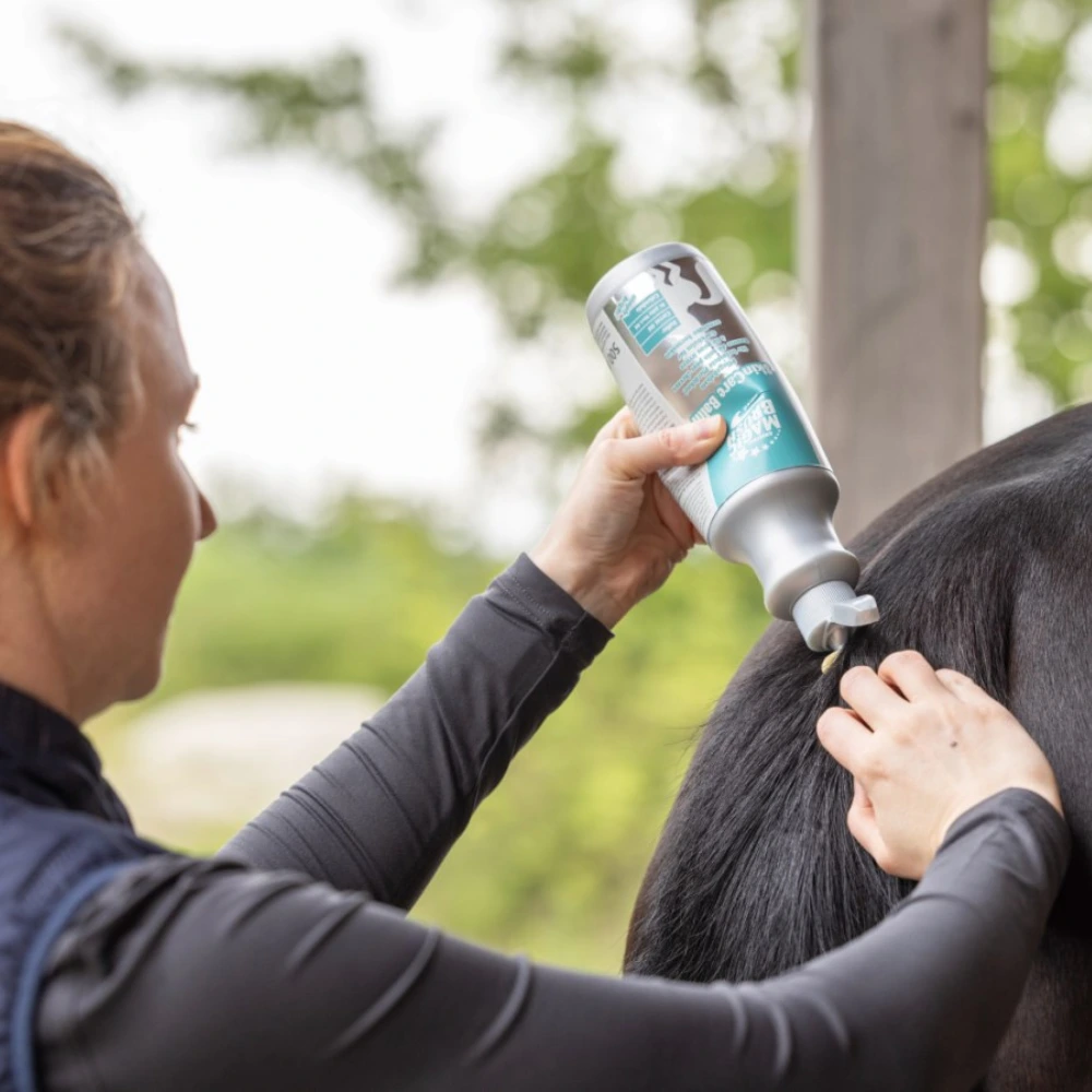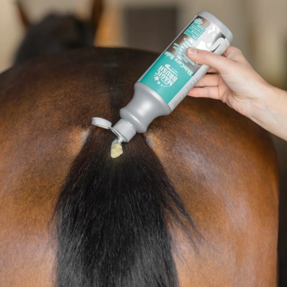 Balzams palīdz saspringtai un niezošai ādai, ko izraisa dažādi vides faktori. Balzama formula ātri iesūcas ādā, nav taukaina un nodrošina ilgstošu un intensīvu kopšanu! Īpaša ātri uzsūcoša formula nekavējoties nogādā augstas kvalitātes sastāvdaļas noslogotajos ādas slāņos. Dabīgie kliņģerīšu, burkānu un asinszāles ekstrakti nodrošina paaugstinātu ādas un apmatojuma noturību. Ir zināms, ka šķidrais sērs mazina niezi un līdz ar to zirga tendenci kasīties.