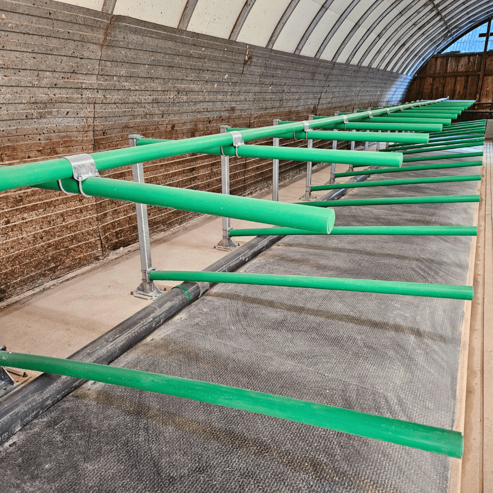 Augšējā polimēra caurule palīdz vadīt govi, kad tā ienāk vai iziet no guļvietas, nodrošinot, ka dzīvnieks guļ taisni un netraucē citiem.